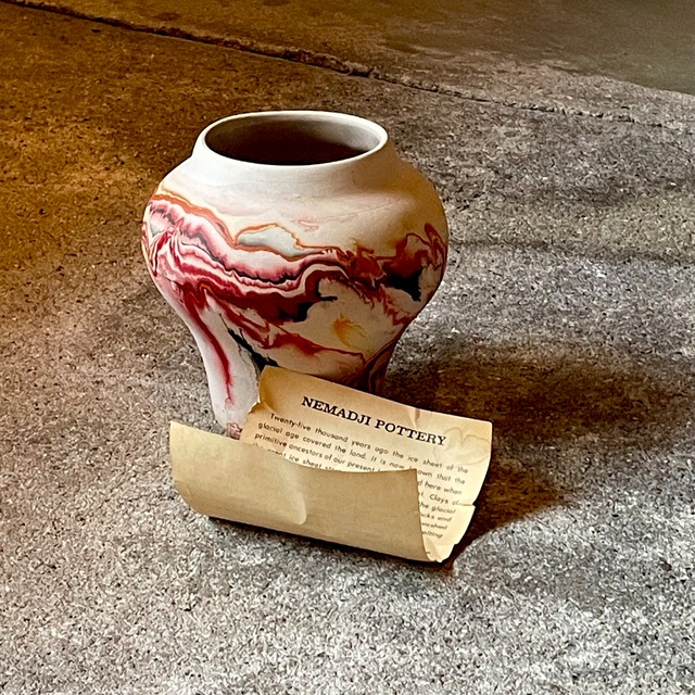 Nemadji Potteryのヴィンテージベースです Nemadji Pottery アメリカのミネソタ州にあるNemadji Tile&Pottery Co. 工房の歴史は古く、1923年代から2002年まで活動していました ネイティブアメリカンのフォークアートをモチーフとして作られており、この特徴的な柄は二つとして同じモノはありません こちらは内側に釉薬が塗られているタイプです SIZE 高さ 約14cm ※年代の古いものですので細かなダメージはご了承下さい