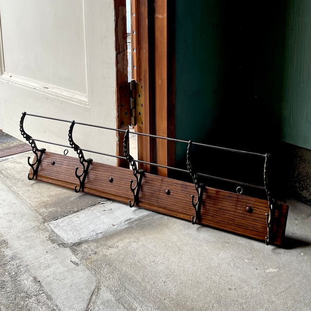 アンティークの5連レイルロードラックです 年々数が少なくなっているのをアメリカで実感します またもちろん6連をカットされたものではなくオリジナルの5連になります 穴などはございますが特に大きなダメージも見られず、このタイプではとても良いコンディションかと思います ショップや飲食店などでも活躍するかと思います SIZE 長さ 78cm 壁面からフック先端までの長さ 15.5cm ※年代の古いものですので細かなダメージはご了承下さい
