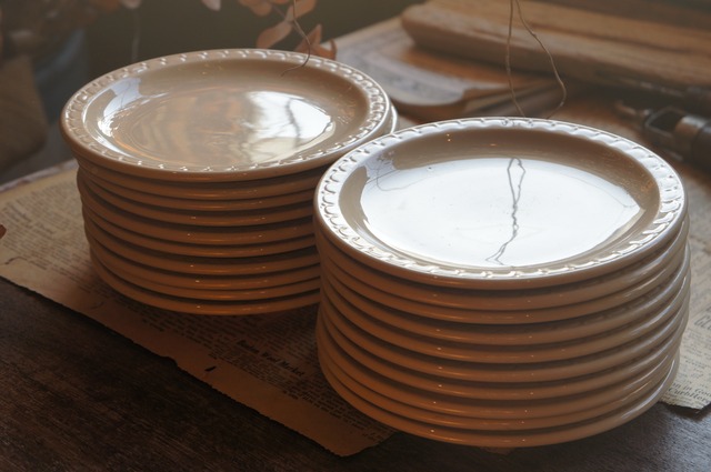 ヴィンテージのレストランウエア・ラージプレートです SYRACUSE 前身の会社であるO.P.Co(Onondaga Pottery Company)は1800年代から存在しており非常に歴史は長いです 当時からレストランやホテル、病院や船等とても酷使される環境の食器を製造しており非常に実績のあるメーカーです こちらはリムに特徴のあるプレートになります また古いアメリカらしいクセになるこのカラーは、アメリカでは数が少ないので複数セットをお探しの方には特におすすめです 最後の比較画像では1番大きいサイズになります バックスタンプから1950年代のものと思われます 僅かなスレ〜未使用に近いコンディションです SIZE Φ 24cm ※年代の古いものになりますので細かなダメージ等はご了承下さい ※それぞれ単体の価格になります