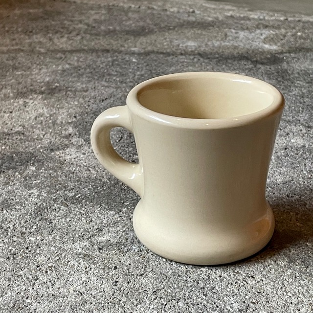 ヴィンテージのヘビーマグです WALKER CHINA ※china=陶磁器 1923年にBailey Walker China(後のWalker China)が創業され、当時からレストランやホテル、蒸気船などへ向け食器を生産していました バックスタンプより1940年代と思われます ヘビーマグでは希少なベージュカラー またこちらはベージュカラーでもより濃いタイプです さらにこちらは嬉しいストライプ入りです 全体的に若干の特有の使用感有り また底面もそれなりに使用感が見られます 古いダイナーウエアに慣れている方でしたら問題はないかと思いますが神経質な方はお控え下さい SIZE 高さ 8cm 口外径 8 cm 容量 およそ 200ml 重量 447g ※年代の古いものになりますので細かなダメージ等はご了承下さい