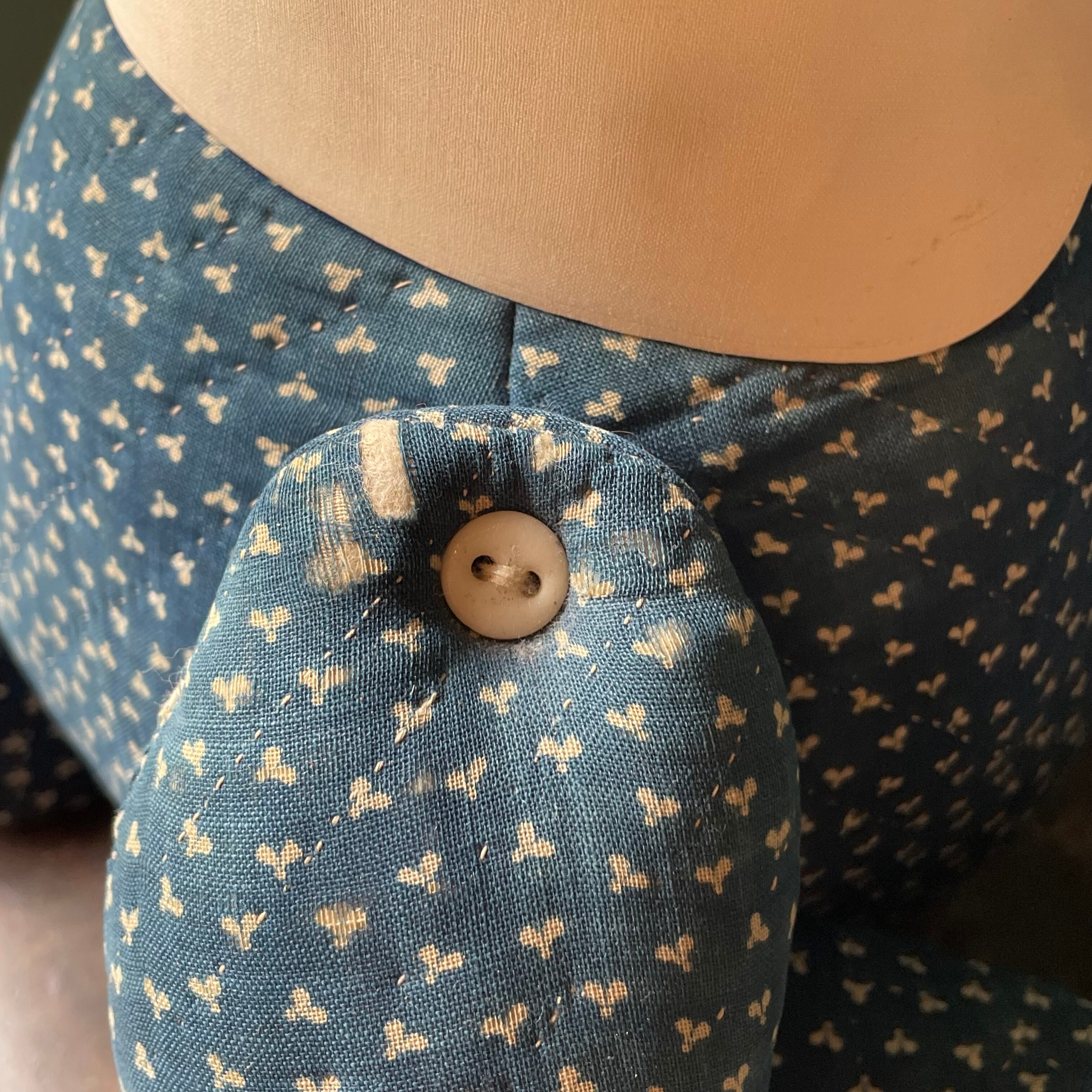 贅沢にインディゴキャリコが全体に使われており、カラー、ボタンも全て古いものになります